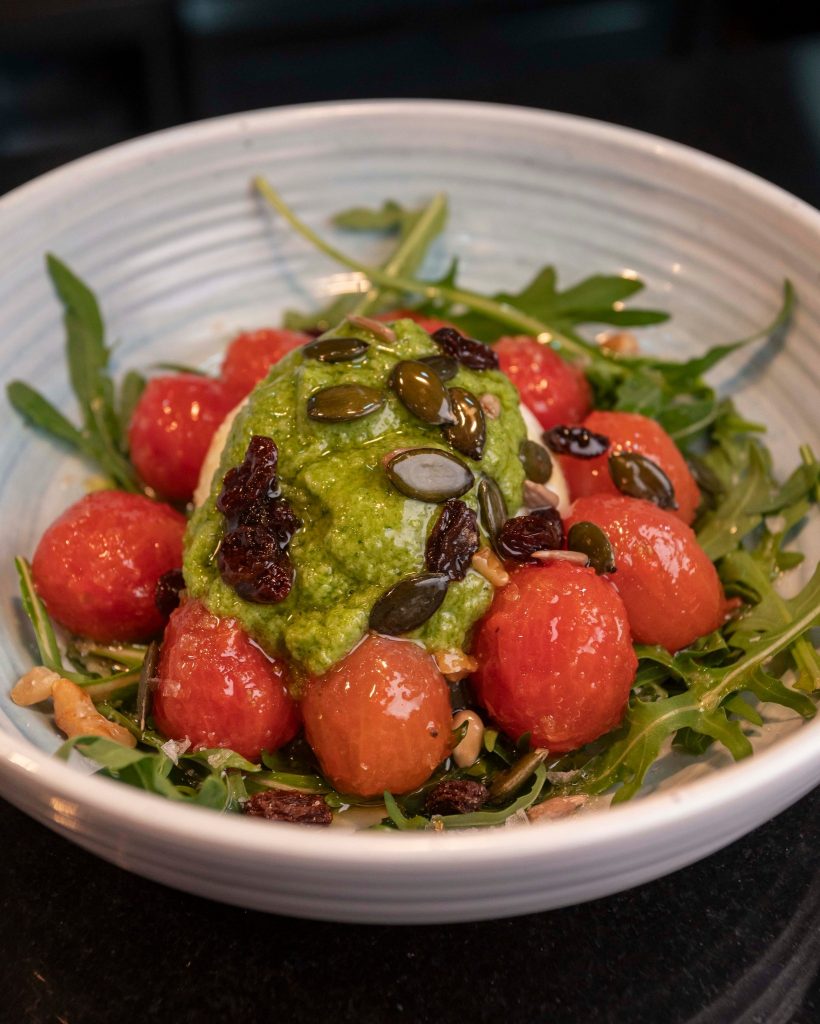 La cremosa burratina combinada con cherrys caramelizados y pesto casero crea una experiencia única, deliciosa y con ese punto de sofisticación que hace especial cualquier cita.