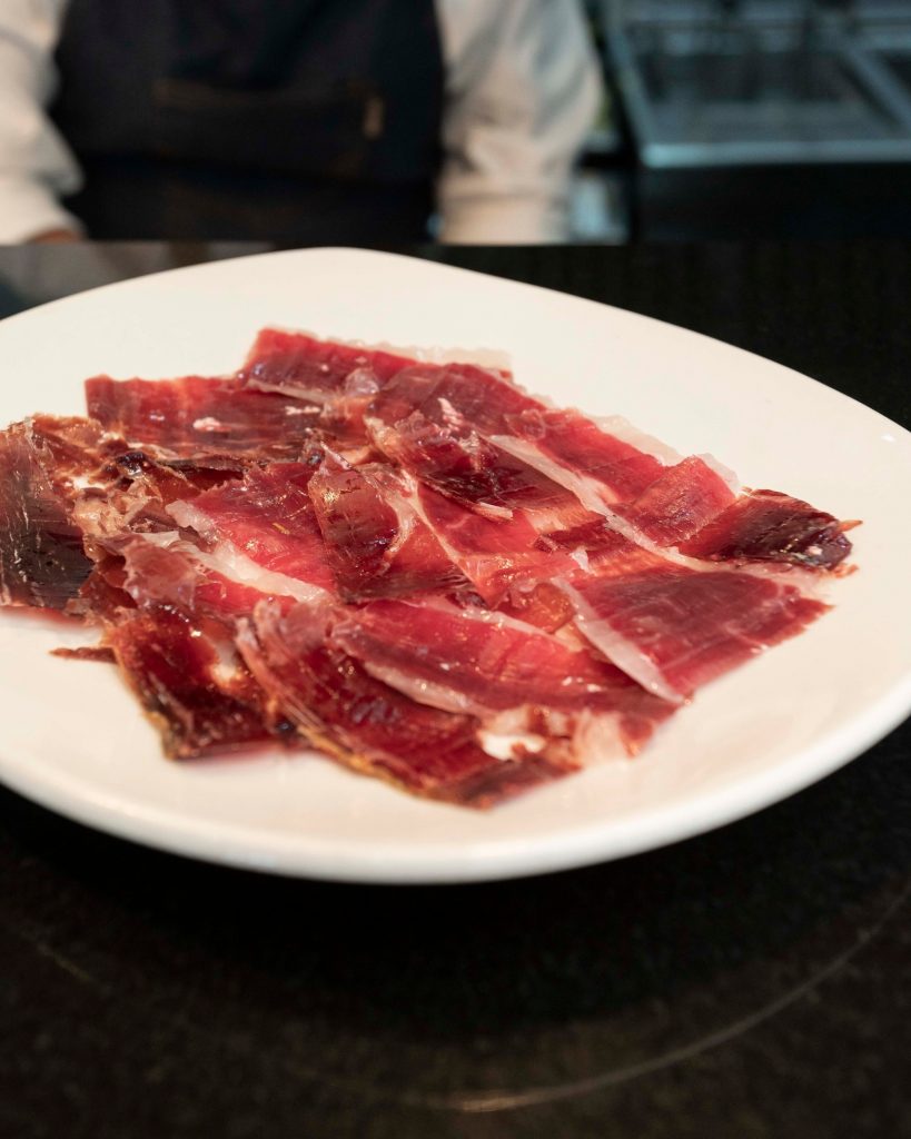 Corte fino de jamón de bellota, que realza su textura mantecosa y sabor intenso. Servido sobre pan de cristal con tomate, aporta proteínas y grasas saludables para un entrante equilibrado.